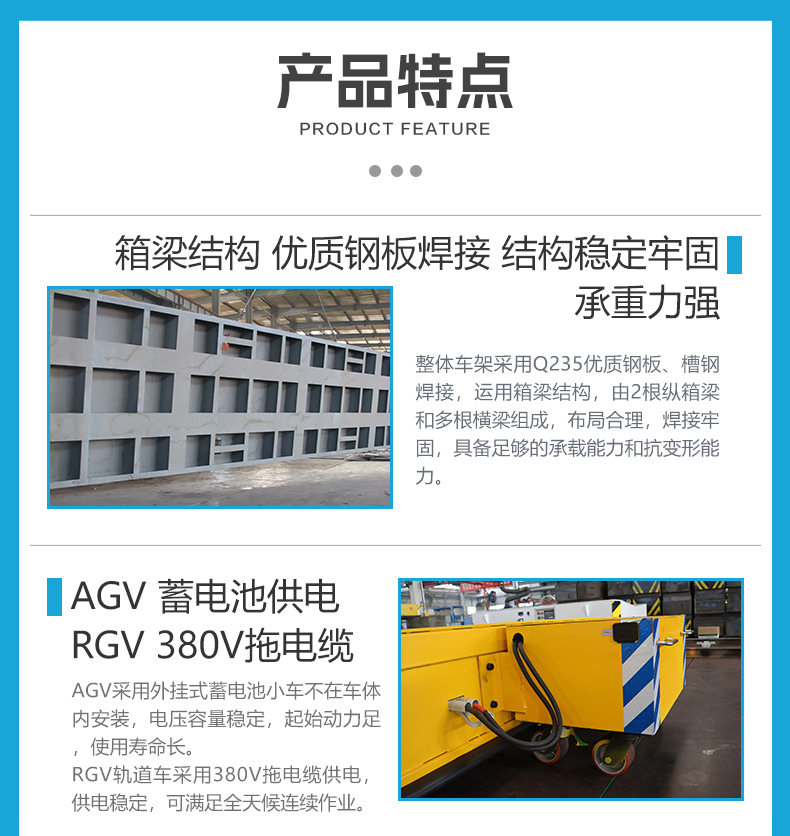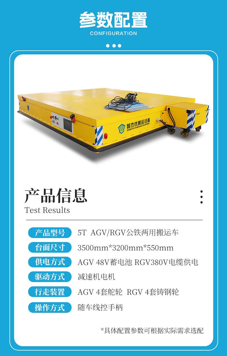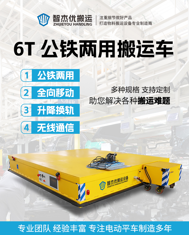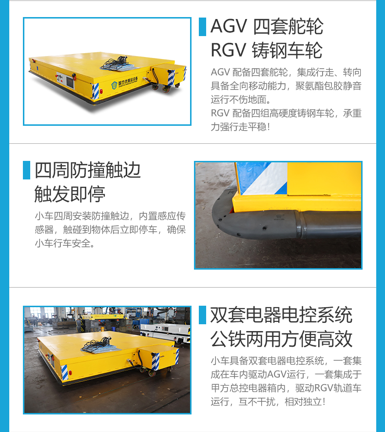 描   述: 一臺車的價錢,滿足兩種使用工況,賺到了!AGV/RGV公鐵兩用電動平板搬運車,專為復雜工況特別定制,一車雙擁打破場景限制,AGV自由靈活全向移動滿足柔性化轉運、RGV承重力強連續作業滿足重載轉運需求,轉換開關一鍵切換瞬間完成角色轉換,無需更換設備適應復雜場景,設備轉運效率飆升,助力企業降本增效!