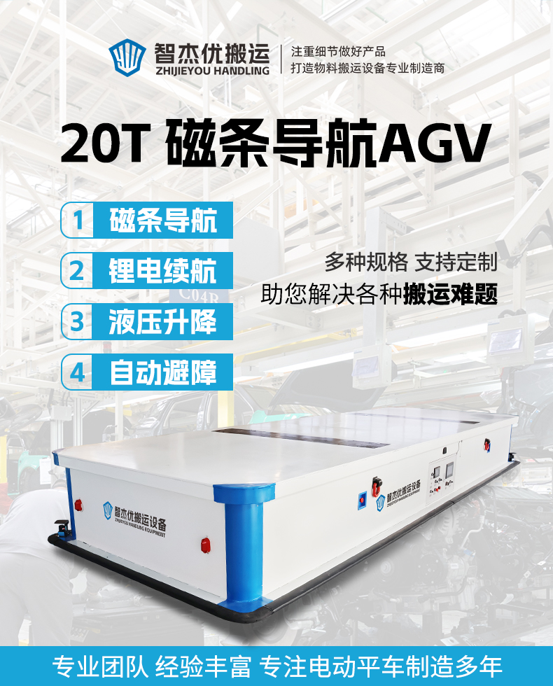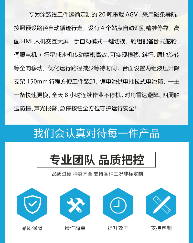 熱線:15517329551 專為涂裝線工件運輸定制的20噸重載AGV,采用磁條導航,按照預設路徑自動循跡行走,設有4個站點自動識別***???,高配HMI人機交互大屏,手自動模式一鍵切換,輪組配備臥式舵輪,伺服電機+行星減速機傳動精密高效,可實現橫移、斜行、原地旋轉等全向移動,優化運行路徑減少等待時間,臺面設置兩組液壓升降支架150mm行程方便工件裝卸,鋰電池供電抽拉式電池箱,一主一備快速更換,全天8小時連續作業不停機,對角雷達避障、四周觸邊防撞、聲光報警、急停按鈕全方位守護運行安全!
