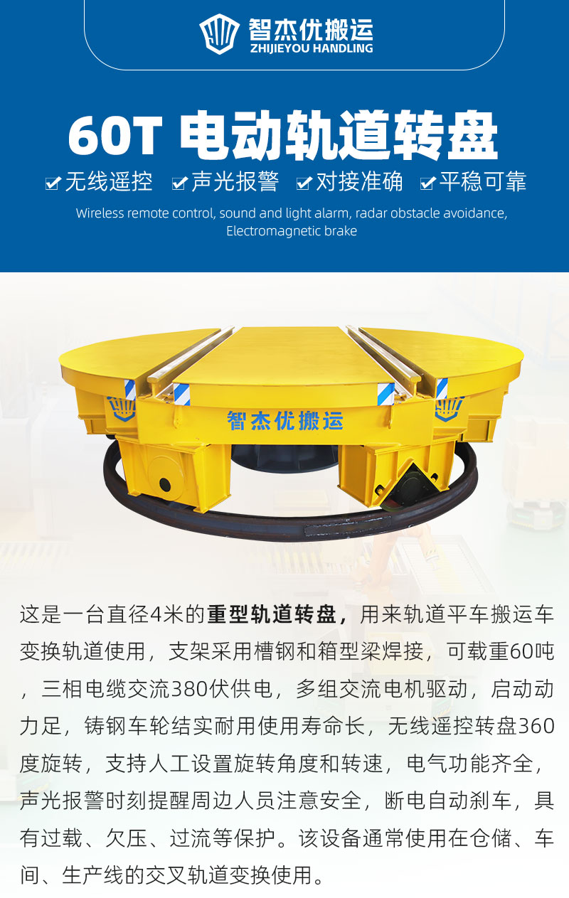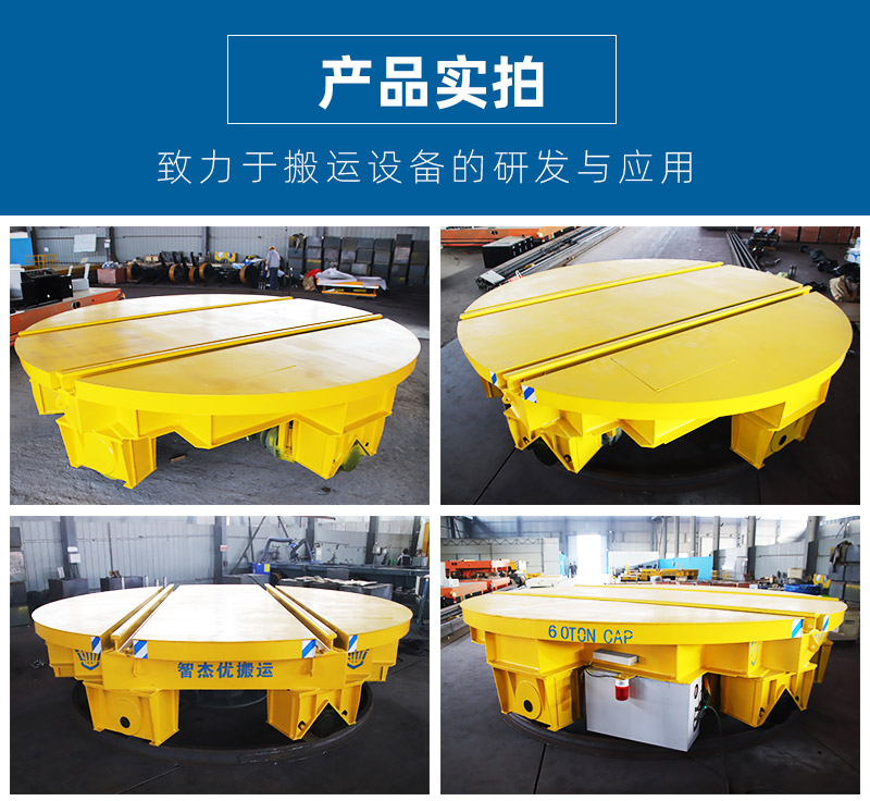 描   述: 這是一臺直徑4米的重型軌道轉盤,用來軌道平車搬運車變換軌道使用,支架采用槽鋼和箱型梁焊接,可載重60噸,三相電纜交流380伏供電,多組交流電機驅動,啟動動力足。