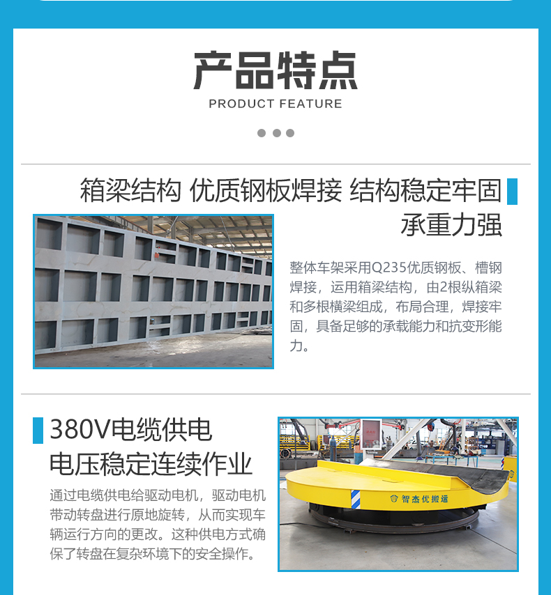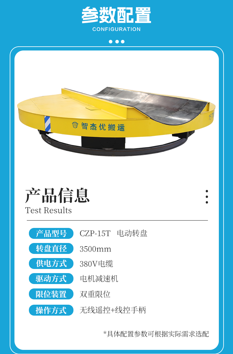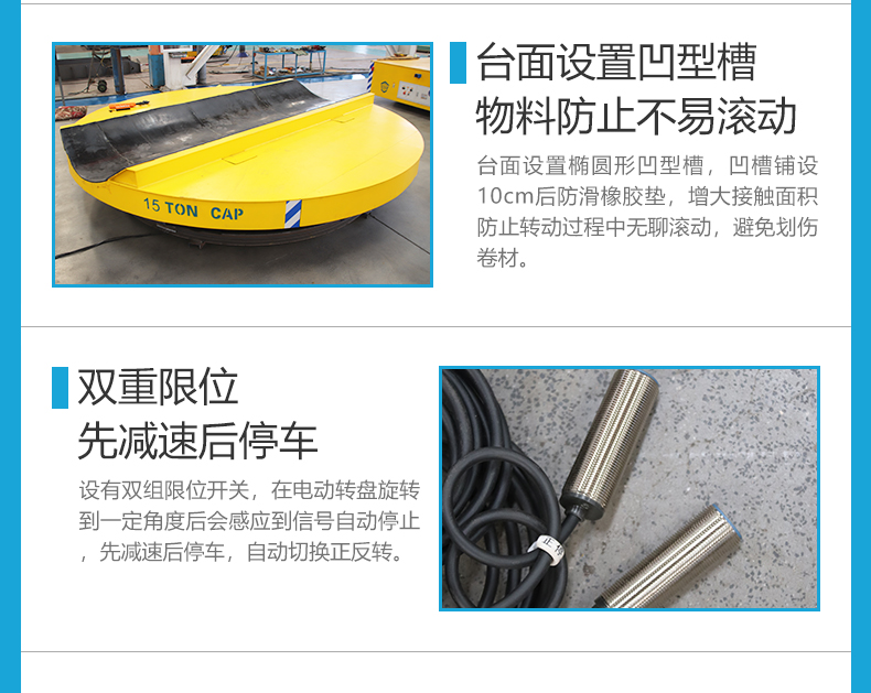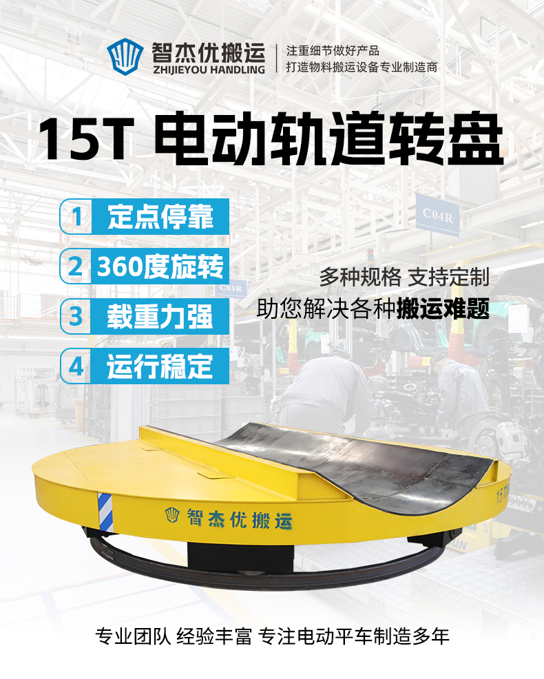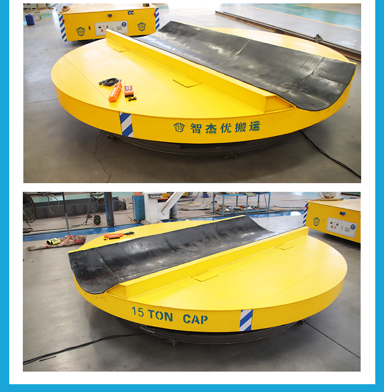 熱線:15517329551 直徑3.5米載重15噸的電動轉盤旋轉臺,客戶用于直徑1.5米長10米復合材料卷的原地掉頭作業,平臺上方設置橢圓形凹槽方便物料放置,上方鋪設10cm厚橡膠防滑墊,防止在旋轉過程中物料晃動避免劃傷物料,通過設置限位開關雙重限位,旋轉到180度自動先減速再緩慢停車,無線遙控控制轉盤正反轉操作簡單方便,采用電機減速機驅動,啟動平穩緩慢無沖擊,380V電纜線供電不受蓄電池容量限制,可全天候連續作業,旋轉速度可調節,設有高中低三個檔位,電磁制動斷電自動剎車,聲光報警時刻提醒工作人員注意避讓安全性高,結構穩定維護簡單,電動轉盤的運用,幫助客戶解決長物料掉頭難的問題節省人力提升效率,智杰優搬運專注各種類型搬運設備非標定制,咨詢我獲取同款車型報價!