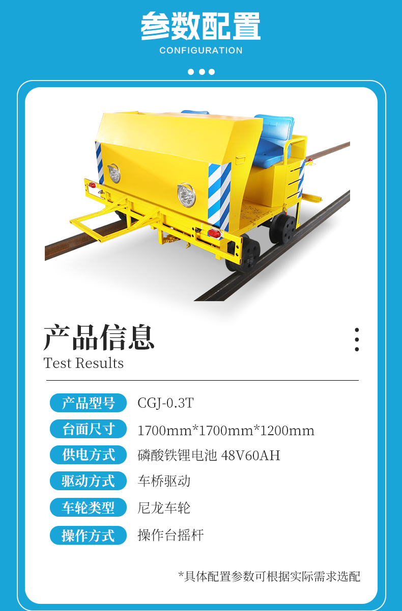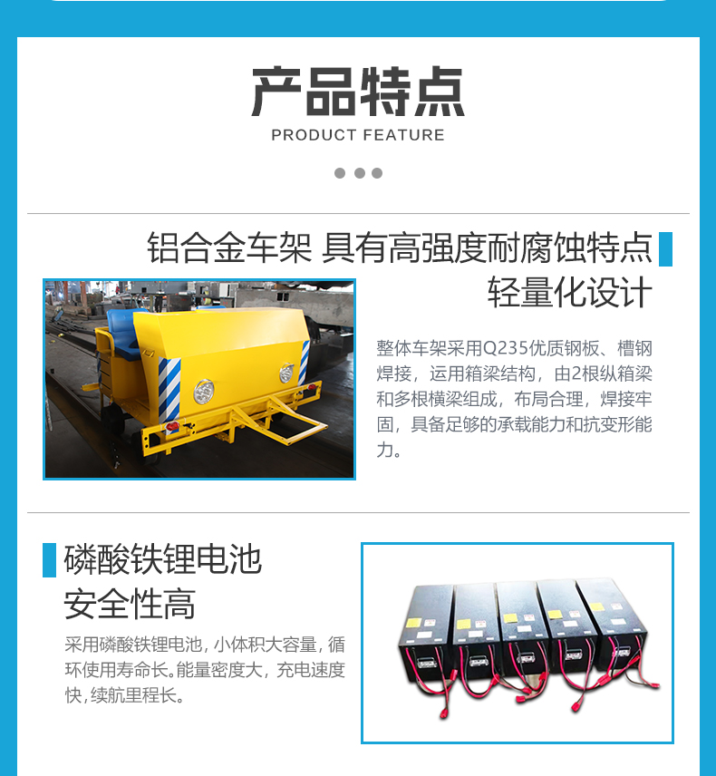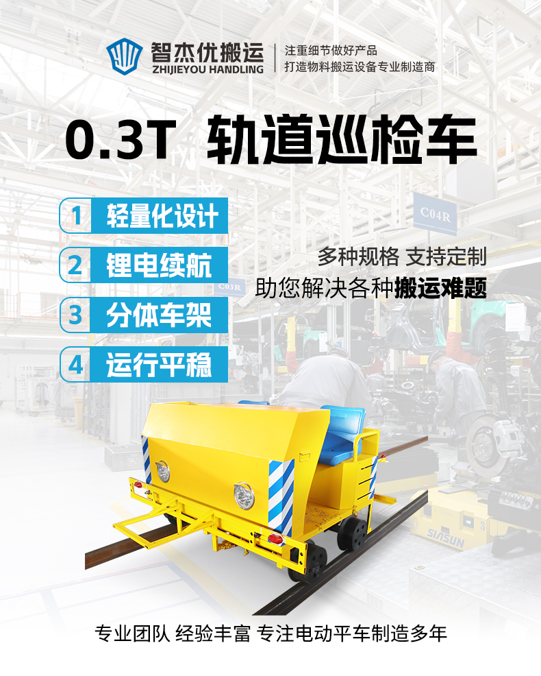 描   述: 智杰優搬運為客戶定制的載人軌道巡檢車,長寬1.7米高1.2米額定載重0.3噸,主要用于搭載檢測儀器對軌道進行探傷檢查,鋁合金車架輕量化設計、具有高強度耐腐蝕特點,前后加裝支架,后側支架延伸長度2.1m采用折疊結構,用于搭載固定檢測儀器,配備主副駕兩個座位,操作臺搖桿控制車輛運行,運行速度5km/h速度可調節,鋰電池供電容量大跑的遠,尼龍車輪防滑耐磨減少噪音,良好的減震性能有效減少軌道對車輛的沖擊
