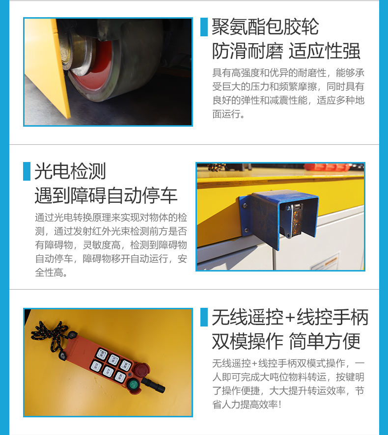 描   述: 車(chē)間內(nèi)物料周轉(zhuǎn)無(wú)軌地平車(chē),3米*1.6米車(chē)身0.45米低重心設(shè)計(jì),適用于車(chē)間、倉(cāng)庫(kù)、裝配線(xiàn)、堆場(chǎng)等工況的大宗物料運(yùn)輸搬運(yùn),堅(jiān)固箱梁結(jié)構(gòu)車(chē)架搭配聚氨酯車(chē)輪平穩(wěn)運(yùn)輸安全可靠,靜音運(yùn)行不傷地面保護(hù)環(huán)氧地坪告別噪音煩惱,蓄電池供電配備全自動(dòng)智能充電機(jī)隨用隨充,減速機(jī)電機(jī)驅(qū)動(dòng)動(dòng)力穩(wěn)定啟停平穩(wěn)無(wú)沖擊,具備前進(jìn)后退、左右轉(zhuǎn)彎、原地旋轉(zhuǎn)運(yùn)動(dòng)控制,光電檢測(cè)動(dòng)態(tài)感知障礙物遇障即停,保障行車(chē)安全,減少人力依賴(lài)、縮短搬運(yùn)