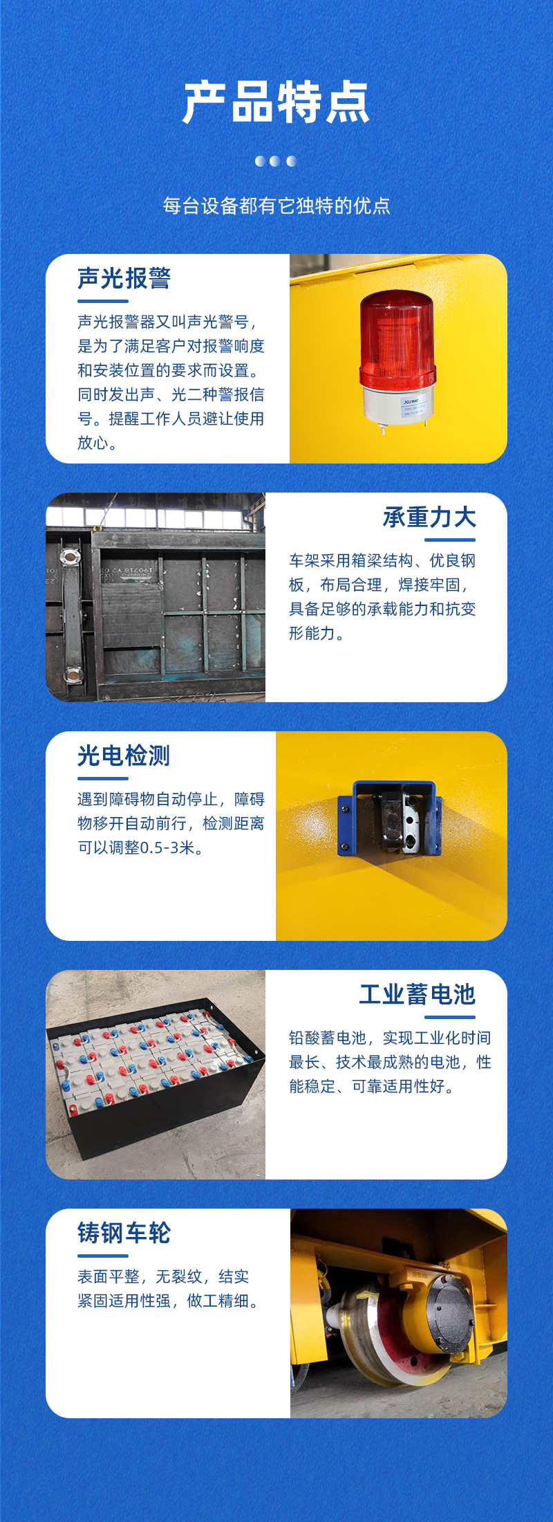 這是一臺(tái)轉(zhuǎn)彎軌道平車試機(jī)現(xiàn)場(chǎng),整車長寬1.2米 高0.45米,載重2噸。平車小巧靈活,運(yùn)行在轉(zhuǎn)彎軌道上,無線遙控平車前進(jìn)后退,蓄電池供電節(jié)能環(huán)保,配備8個(gè)鑄鋼車輪硬度高耐磨防滑,加裝導(dǎo)向輪及回轉(zhuǎn)支撐,確保彎道行駛運(yùn)行流暢平穩(wěn)、防止掉道,平車內(nèi)側(cè)前后設(shè)有限位開關(guān),可設(shè)置多點(diǎn)位自動(dòng)停靠,方便用戶定點(diǎn)搬運(yùn)作業(yè),安全裝置上平車具備欠壓、過壓、過流、超載、短路、低電量等防護(hù),前后配備光電檢測(cè),遇障自停,聲光報(bào)警提醒避讓!