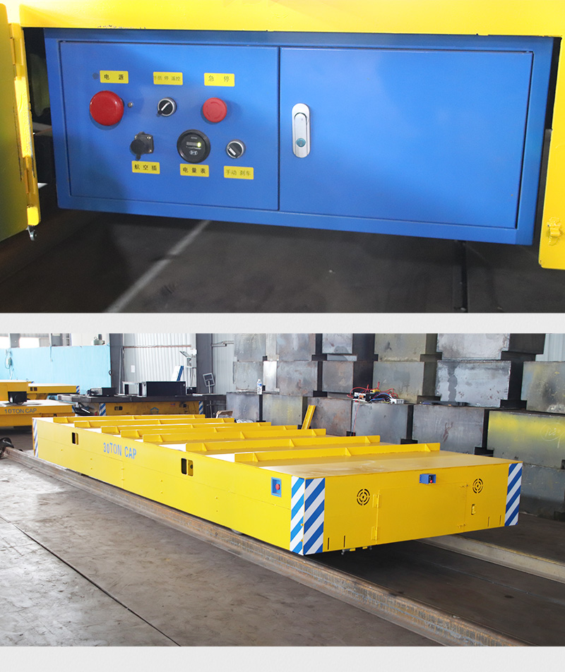 描   述: 噴砂房軌道搬運車電動平板轉運車,長6米寬2米高0.6米載重30噸,客戶用于噴砂房物料的轉運工作,電氣箱、電機、電池組均做防塵防水設計,無線遙控操作、雙組限位開關平車可定點停靠,雙組電機減速機驅動力足傳動效率高。