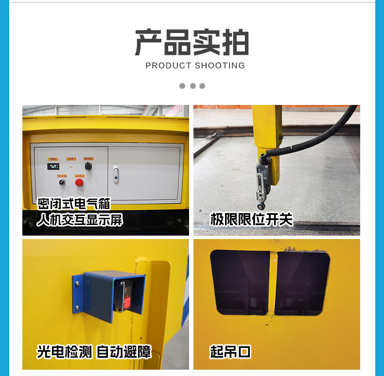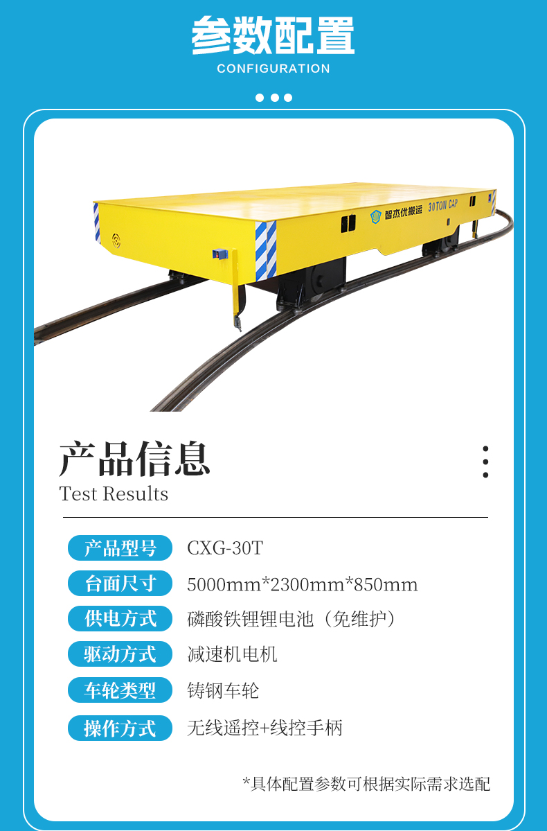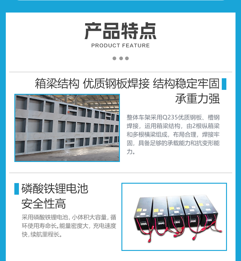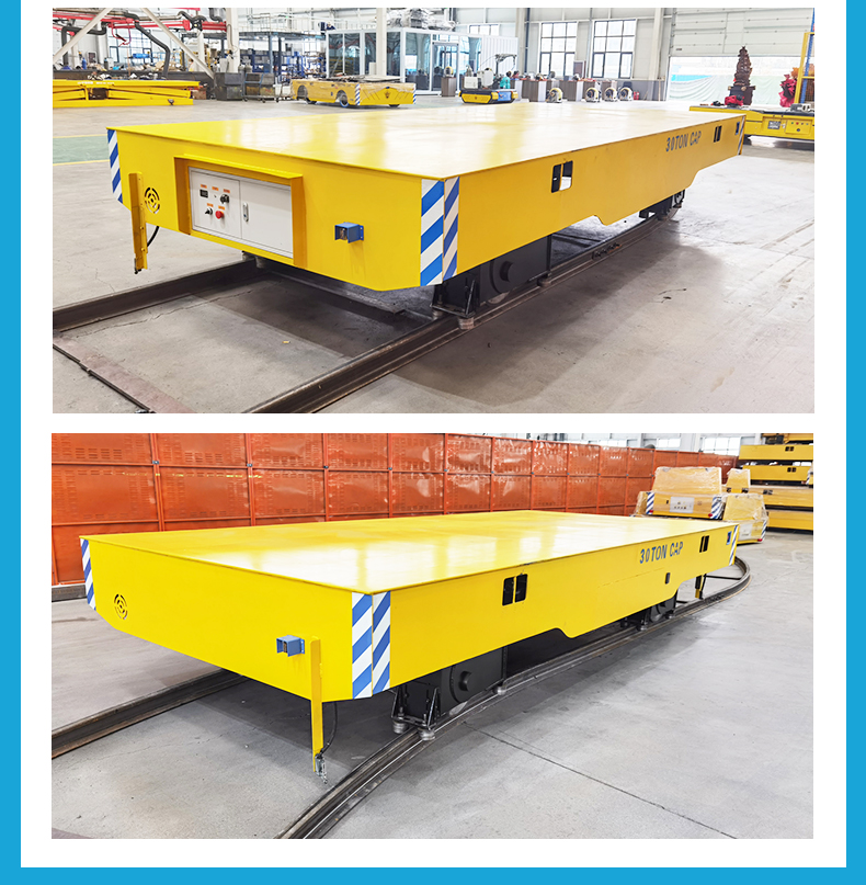 描   述: 30噸鋰電池轉彎軌道搬運車,整車長5米寬2.3米高0.8米額定載重30噸,車架箱梁結構,優質鋼板焊接結實耐用,客戶用于鑄造件的跨車間運輸,運行路線有上坡轉彎路段,驅動輪加裝輔助轉向導向輪具有轉彎功能,離地間隙大具備爬坡能力,鋰電池供電容量大充電快,無線遙控操作簡單方便,30噸大載重滿足車間來回轉運物料需求,運行速度0.20m/min,安全裝置設置極限限位開關防止軌道車沖出軌道,光電檢測遇到障礙自動