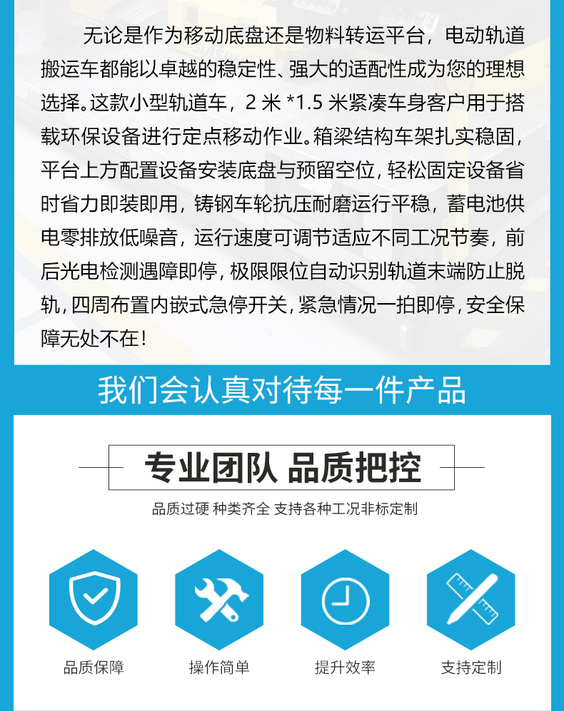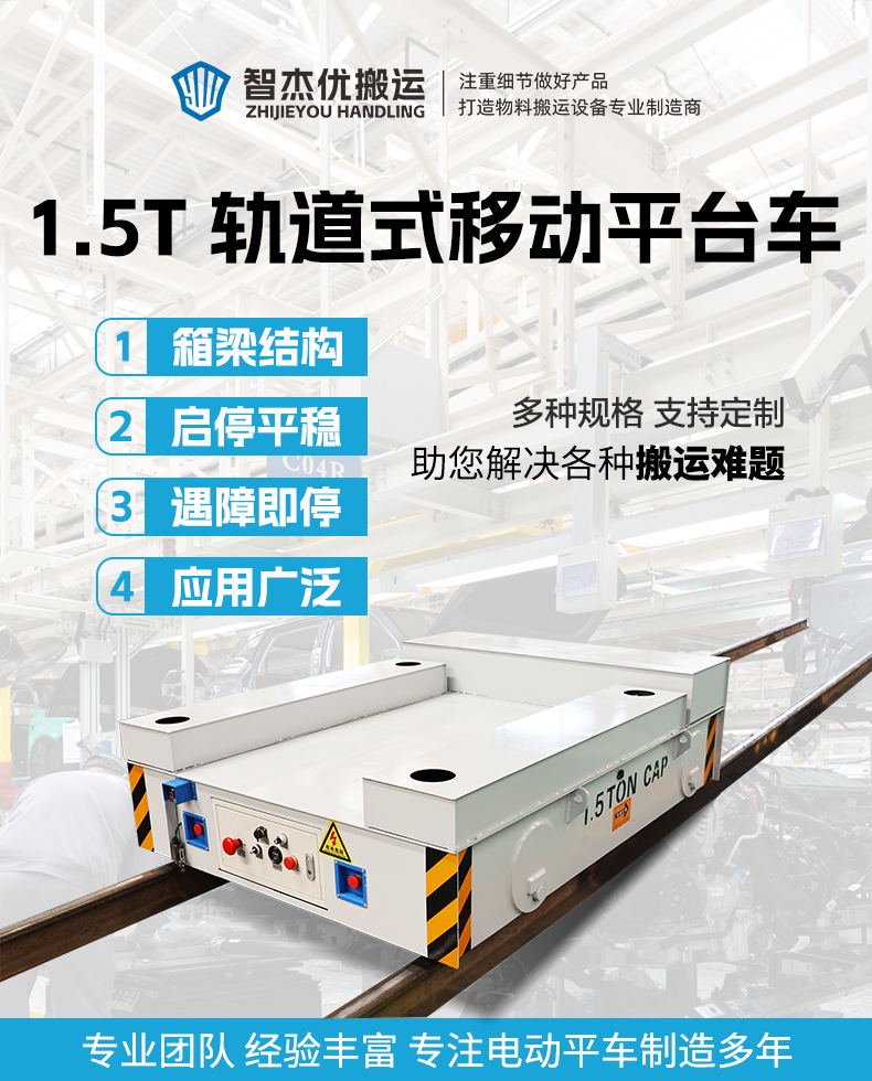 描   述: 環(huán)保設(shè)備需要移動(dòng)底盤?這款小型軌道搬運(yùn)車就很合適!卓越的穩(wěn)定性、強(qiáng)大的適配性和多重安全防護(hù),無論用于設(shè)備的搭載作業(yè)還是車間內(nèi)的物料過跨,都是您的理想選擇!