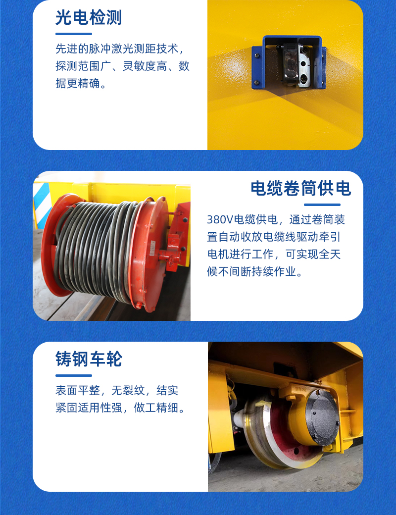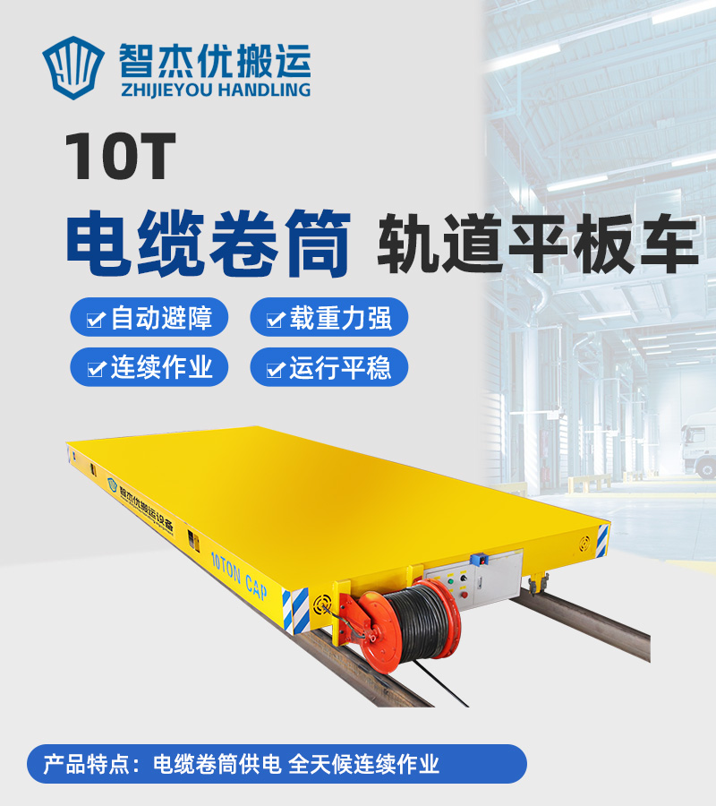 熱線:15517329551 電纜卷筒軌道電動平車,整車長6米寬2.5米高0.5米,車架箱梁結構承重力強可搬運10噸的貨物,380V電纜供電,設有卷筒裝置自動收放電纜線,可滿足全天候的作業需求,平車運行距離20米,運行速度0-20m/min,支持變頻調速,無線遙控和有線手柄兩種操控方式,操作簡單方便快捷,是車間短距離物料轉運的專業選手。