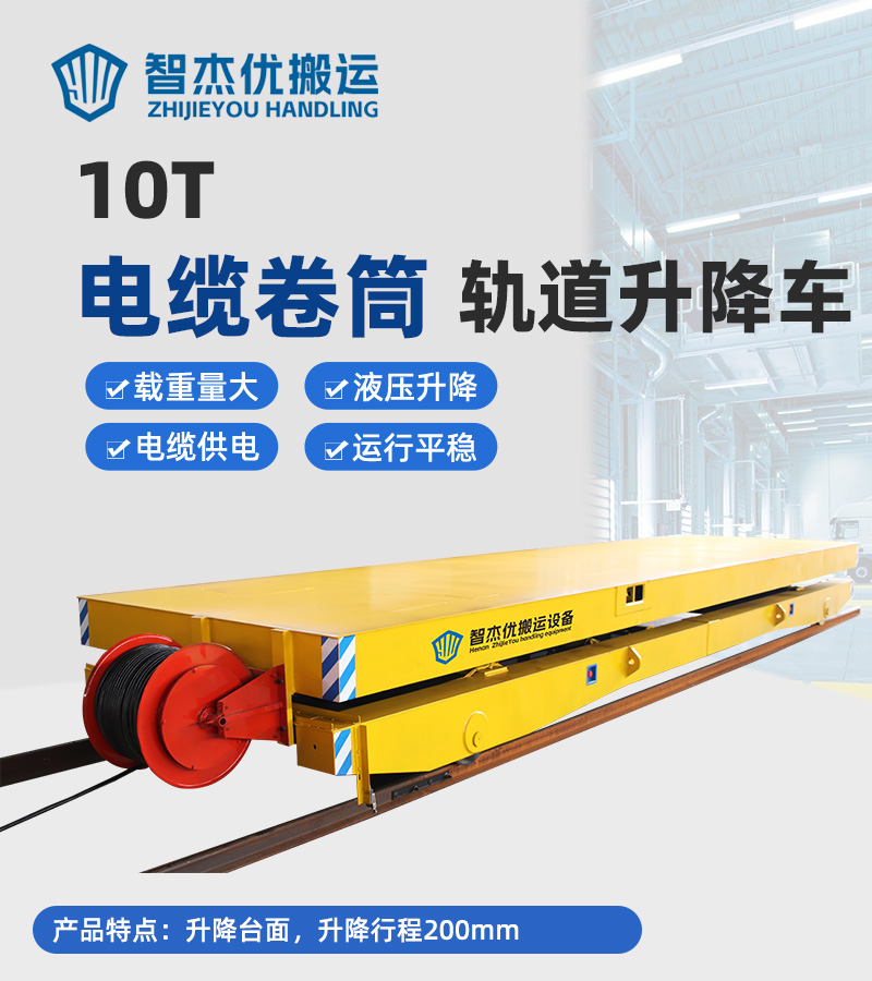 熱線:15517329551 智杰優搬運為鋼結構加工企業定制的電纜卷筒軌道升降車,整車長8米寬2.1米高0.7米載重10噸,主要用于車間生產線之間鋼材原料的運輸作業,平車設有升降裝置可根據需求調整載貨平臺高度,升降行程200mm,適應不同高度的裝卸作業,增加了設備的靈活性,電纜卷筒供電,卷筒自動收放電纜線避免纏繞和損壞延長了電纜的使用壽命,同時也保證了供電的穩定性,線控手柄操作平車前進后退簡單方便,雙組行程開關可實現起始終點定點???。