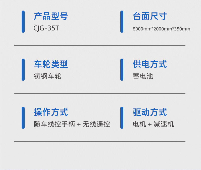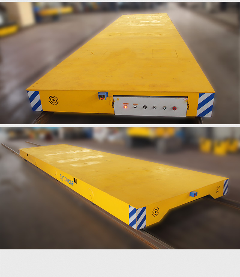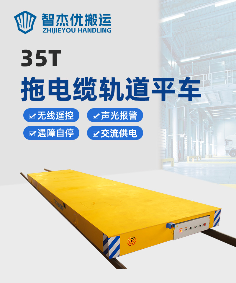 描   述: 這是一款拖電纜軌道電動平板車,該車長8米、寬2米、高0.35米,采用電纜供電,使用時間不受限制。底盤箱型梁焊接可承重35噸,鑄鋼車輪結實耐用,平臺高度低行走平穩,不易側翻貨物,無線遙控操作簡單,速度可人工調節,適合不同場合下使用。聲光報警時刻提醒現場人員注意避讓,保障作業安全。