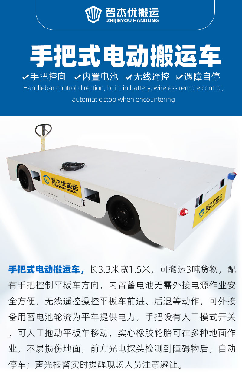 描   述: 長(zhǎng)3.3米寬1.5米,可搬運(yùn)3噸貨物,配有手把控制平板車方向,內(nèi)置蓄電池?zé)o需外接電源作業(yè)安全方便。