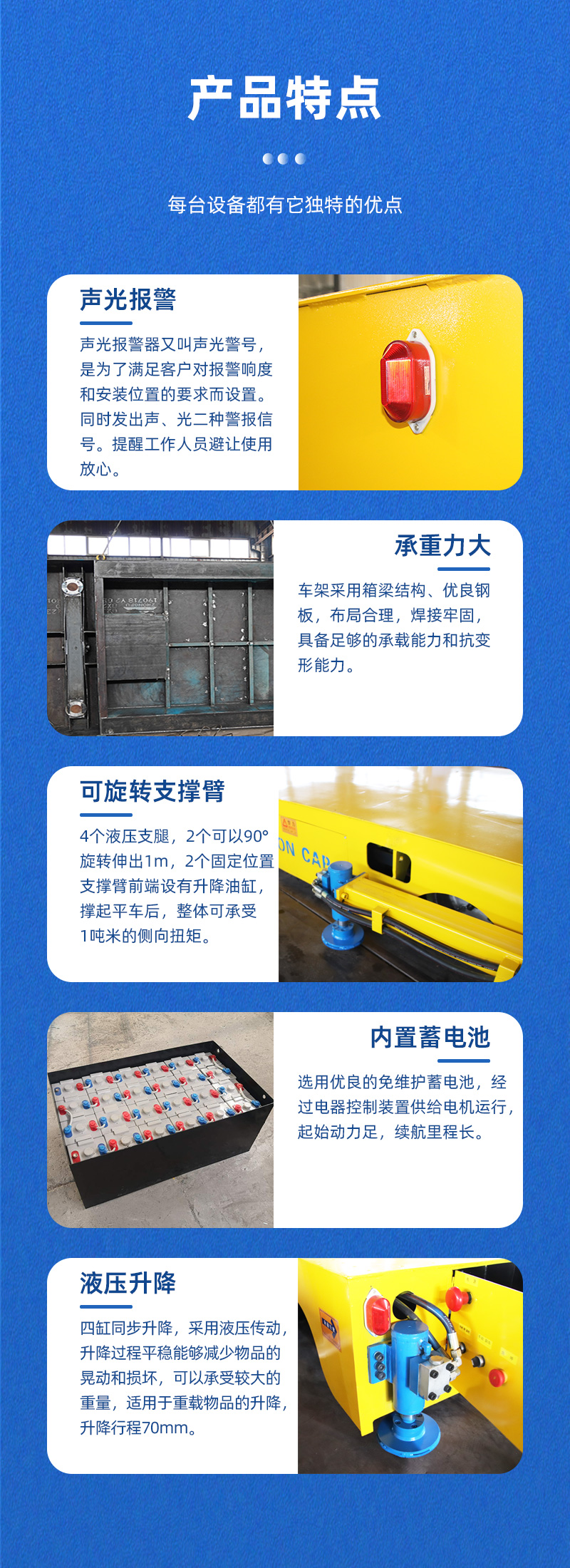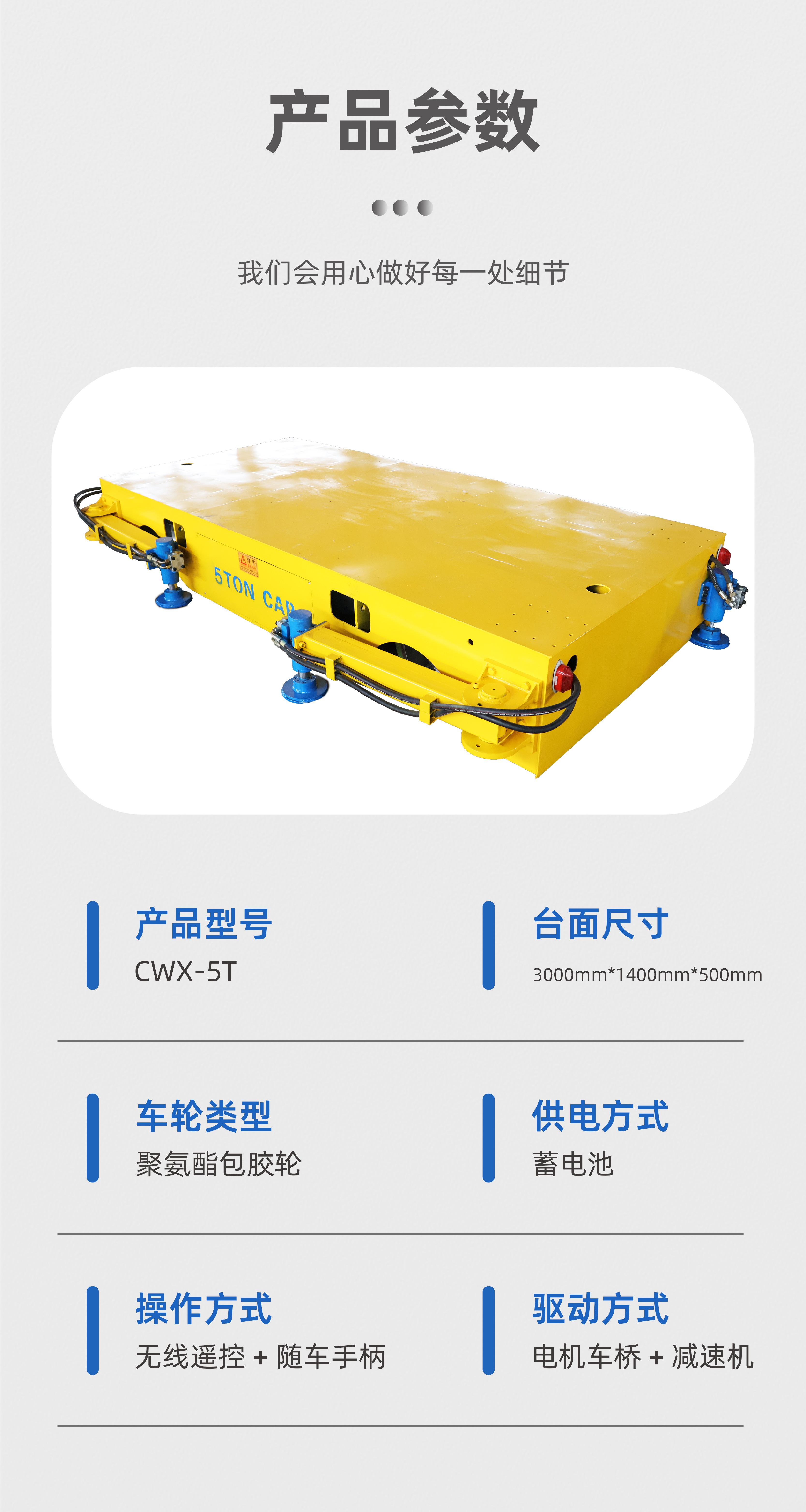 描   述: 整車長3米、寬1.4米、高0.5米。車架采用箱梁結構,穩定可靠可載重5噸,平車設有四個液壓支腿,前側配有2個可伸長1米的支撐臂,四個液壓升降缸可將平車撐起70mm,整體可承受1噸米的側向扭矩,滿足客戶特殊工況使用需求;蓄電池供電,滿載運行2小時,直流電機驅動啟動力足,預留485通訊模塊,可連接外部通訊,實現平車自動化控制,無線遙控平車前進后退、左右轉彎、加速減速等動作,聲光報警保障安全。