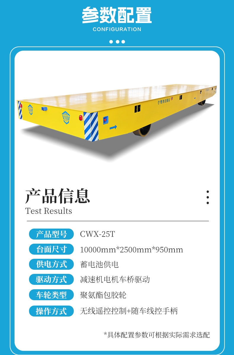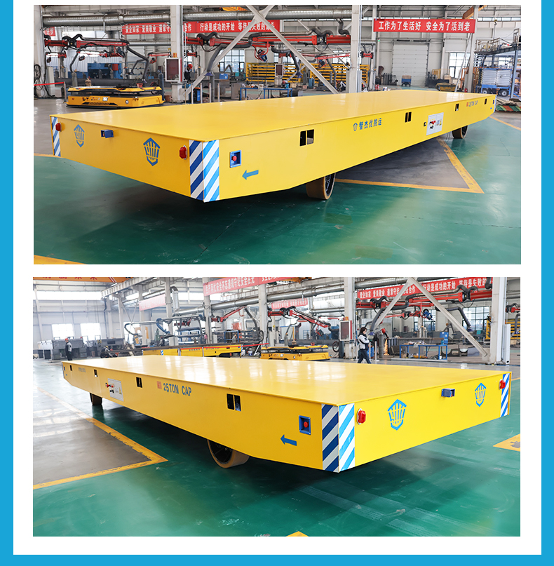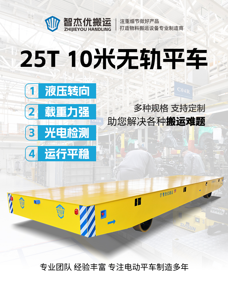 熱線:15517329551 10米無軌搬運車設備運輸平板車,整車長10米寬2.5米高0.95米額定載重25噸,主要用于大型涂裝設備的跨車間轉運作業。車體尺寸根據物料大小一對一定制,車架箱梁結構鋼板焊接穩定牢固載重力強不易變形,耐摔耐砸扛造,蓄電池供電節能環保,無線遙控控制平車前進后退、左轉右轉,速度可調節。減速機電機車橋驅動結構緊湊傳動效率高、液壓轉向穩定靈活,大直徑聚氨酯包膠輪適應多種地面運行,該車設計可爬15度的坡進行室外運行,光電檢測遇到障礙自動停車安全性高,該系列電動平車結構簡單、故障率低、維護簡單,是車間內高效率的搬運工具,可進行深度化定制!