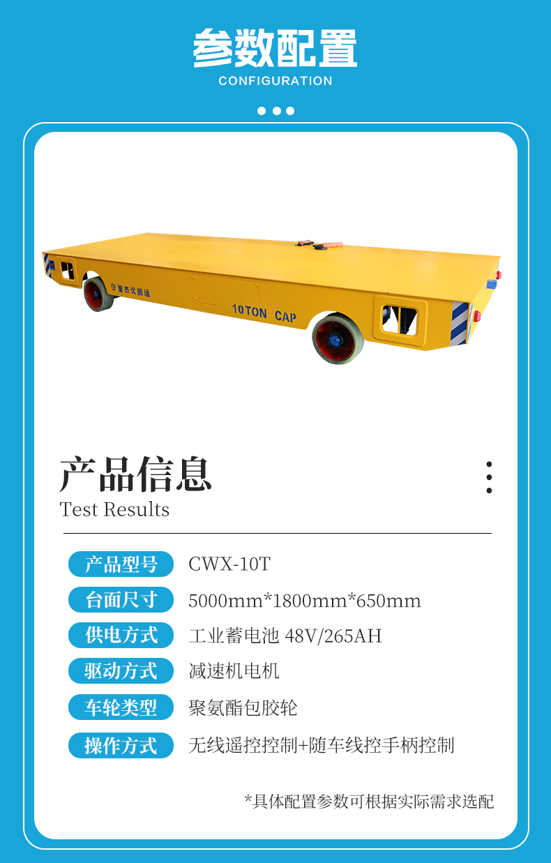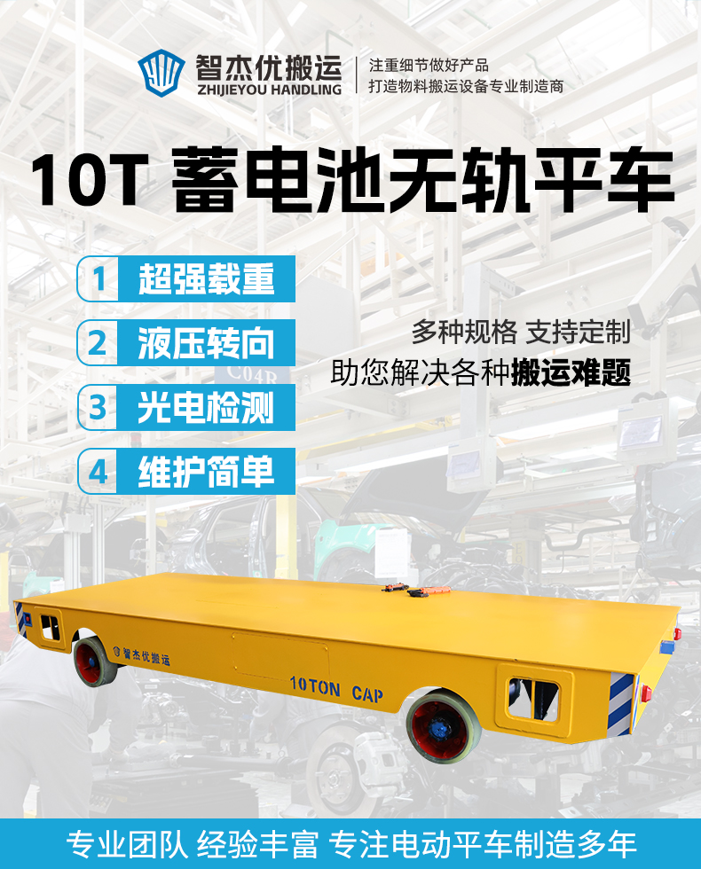 描   述: 5米*1.8米平臺0.65米低重心設計,適配10噸級重型物料,輕松承載鋼板、模具、機械鑄件等重型物料。減速機+電機驅動系統,動力輸出澎湃穩定,配備四個聚氨酯包膠車輪,防滑耐磨靜音運行不傷地坪,室內外場景運行無憂,液壓轉向系統反應靈敏,支持左右靈活轉彎,可在復雜狹窄工況自由運行。大容量蓄電池供電零排放符合環保要求,人工無線遙控操作,前進/后退/轉向一鍵切換,操作簡單上手快,多重安全防護確保運輸安全!