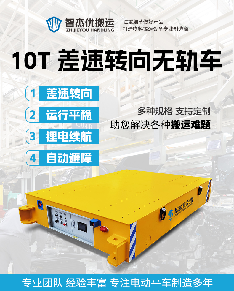 描   述: 長2.4米寬1.7米額定載荷10噸,0.5米低重心設(shè)計方便物料上下裝卸,滿載運行平穩(wěn)轉(zhuǎn)向靈活流暢,無線遙控操作便捷指令接受響應(yīng)迅速,大扭矩減速機電機驅(qū)動力足爬坡輕松不費力,差速轉(zhuǎn)向轉(zhuǎn)彎半徑小狹窄通道靈活騰挪,光電檢測遇到障礙自動停車,適用于大型設(shè)備、模具、原材料等進(jìn)行車間工序間的過跨轉(zhuǎn)運!