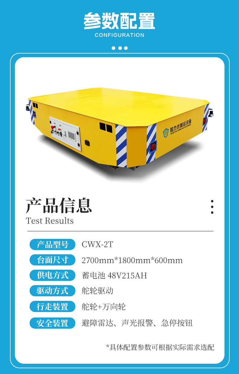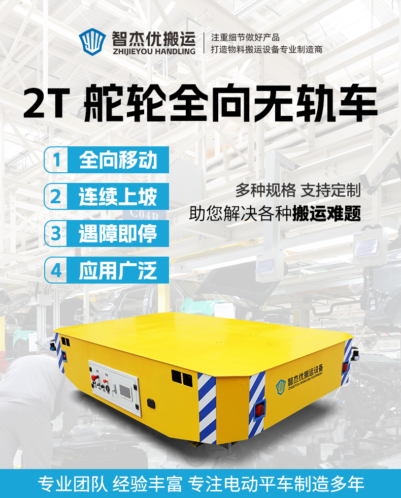 描   述: 舵輪全向無軌車,全向移動車間轉運不繞路,驅動力足輕松上坡不費勁,2噸載荷轉運重型工件、模具、半成品等輕松不費力,還有避障雷達全程保駕護航,是小空間、多工況轉運的王炸神器!