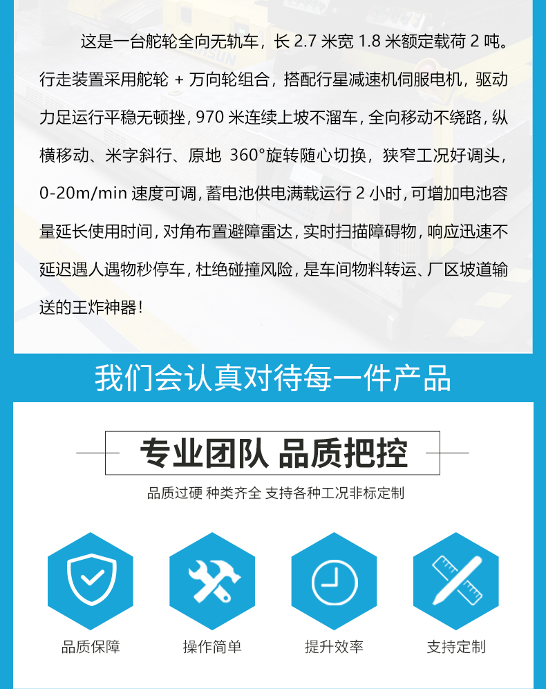 這是一臺舵輪全向無軌車,長2.7米寬1.8米額定載荷2噸。行走裝置采用舵輪+萬向輪組合,搭配行星減速機伺服電機,驅動力足運行平穩無頓挫,970米連續上坡不溜車,全向移動不繞路,縱橫移動、米字斜行、原地360°旋轉隨心切換,狹窄工況好調頭,0-20m/min速度可調,蓄電池供電滿載運行2小時,可增加電池容量延長使用時間,對角布置避障雷達,實時掃描障礙物,響應迅速不延遲遇人遇物秒停車,杜絕碰撞風險,是車間物料轉運、廠區坡道輸送的王炸神器!