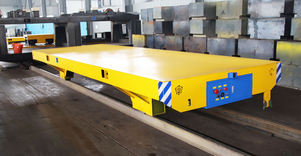 這臺30噸的軌道車主要用于噴砂房設備的搬運工作,將需要噴砂打磨的設備運送至噴砂房進行打磨,隨后再運送出來完成一個工序,平車長6米寬2米高0.6米,這臺車的電機、電池、電氣箱均按照客戶的要求定制防塵罩,起到防塵封閉的作用;臺面設有工字鋼支架,方便設備放置;采用蓄電池供電方式,滿載狀態下運行時間不低于3小時,控制電壓為24V,平車配備60A的智能充電機,充電電流平穩、安全可靠,還可顯示充電狀態充滿自動斷電,防止過充損傷電池;運行速度0-20m/min,速度可調節,通過無線遙控的操控方式操控平車前進后退、加減速。配備4個鑄鋼車輪,硬度高承重力強,在軌道上運行平穩,設有兩組行程開關,可設定地點自動停靠;安全裝置配備有電氣保護、聲光報警、光電檢測、急停開關,平車設有電量表,實時顯示車輛電量信息,低于20%提醒工作人員及時充電,確保平車電量充足隨時搬運!