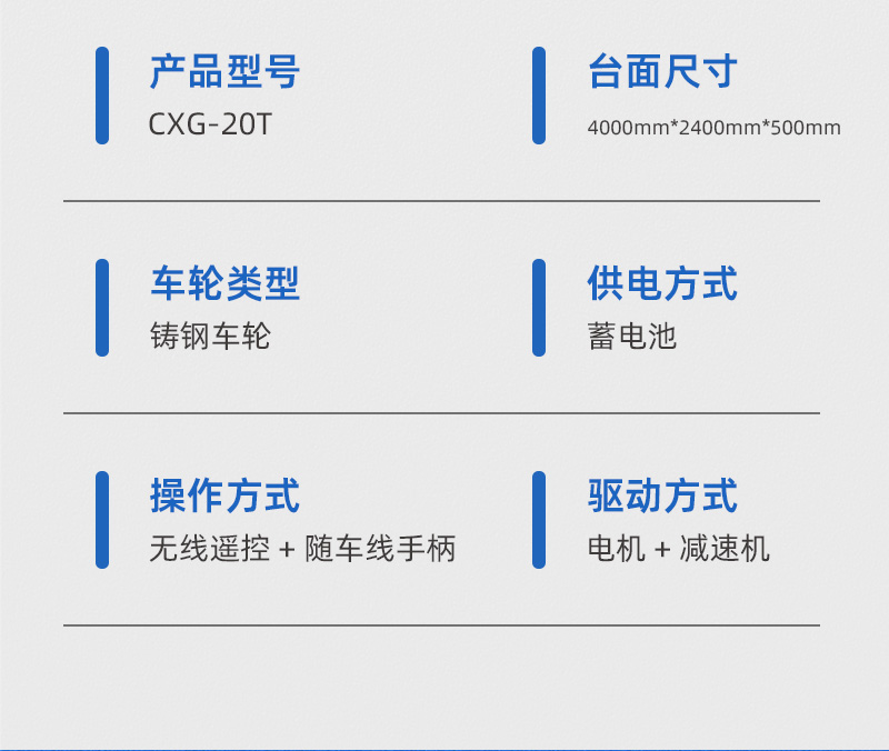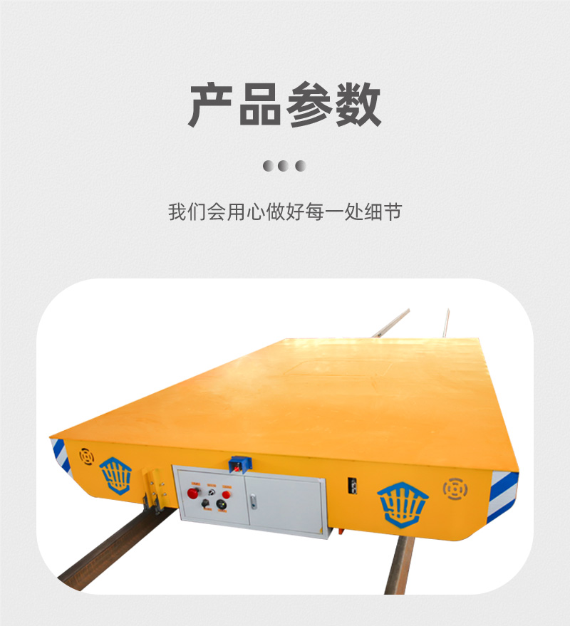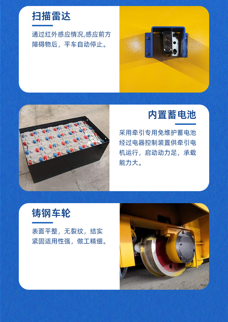 描   述: 這是一臺(tái)蓄電池軌道電動(dòng)平車,該車長(zhǎng)4米,寬2.4米,高0.5米,車架箱型梁焊接可載重20噸,蓄電池供電,運(yùn)行距離不受限制,遙控器一鍵操作,可啟動(dòng)、停止、前進(jìn)、后退、調(diào)速等,設(shè)有雙限位開關(guān),可根據(jù)現(xiàn)場(chǎng)設(shè)定地點(diǎn)自動(dòng)停靠,聲光報(bào)警保障安全,能夠在垂直軌道、L型軌道、S型軌道、弧形軌道及易爆、擺渡場(chǎng)合使用。