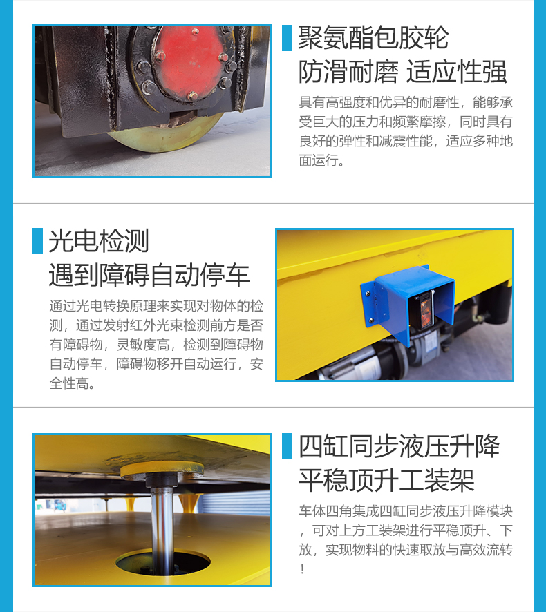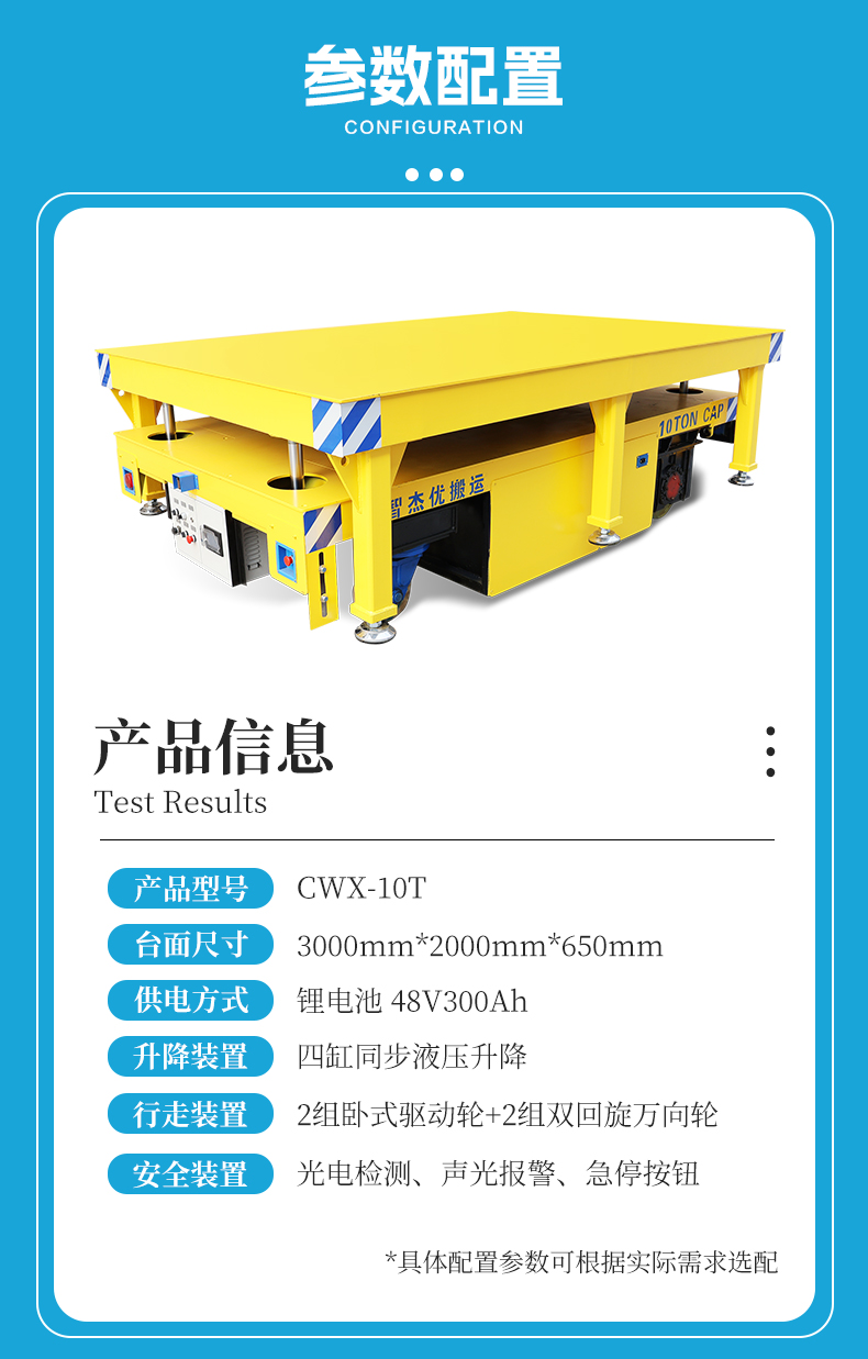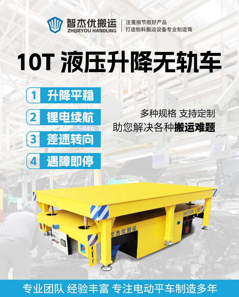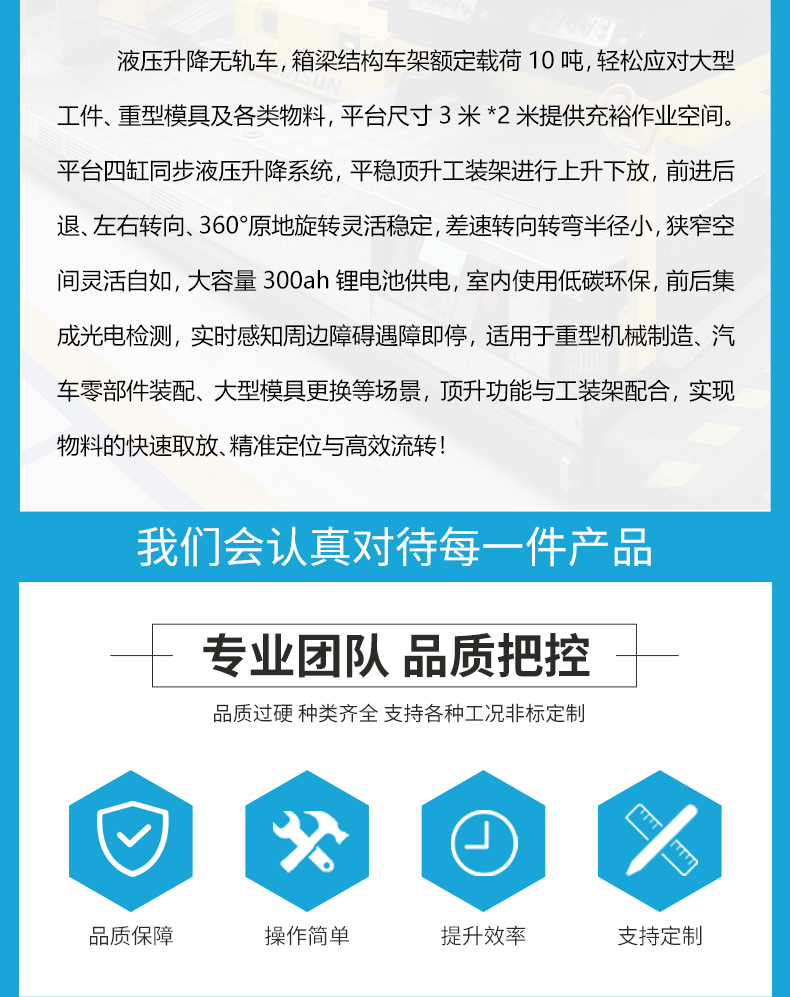 這是一臺液壓升降無軌車,箱梁結構車架額定載荷10噸,輕松應對大型工件、重型模具及各類物料,平臺尺寸3米*2米提供充裕作業空間。平臺四缸同步液壓升降系統,平穩頂升工裝架進行上升下放,前進后退、左右轉向、360°原地旋轉靈活穩定,差速轉向轉彎半徑小,狹窄空間靈活自如,大容量300ah鋰電池供電,室內使用低碳環保,前后集成光電檢測,實時感知周邊障礙遇障即停,適用于重型機械制造、汽車零部件裝配、大型模具更換等場景,頂升功能與工裝架配合,實現物料的快速取放、***定位與高效流轉!